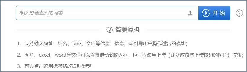 建設(shè)統(tǒng)一入口界面,實(shí)現(xiàn)用戶的多種輸入方式,包括但不限于各類碼址、名稱、地址、特征片段、數(shù)據(jù)文件、文檔文件等。支持通配符方式;支持中英文兩個(gè)語種的輸入支持和判斷,支持中英文混合輸入;支持多條信息或文件的輸入。